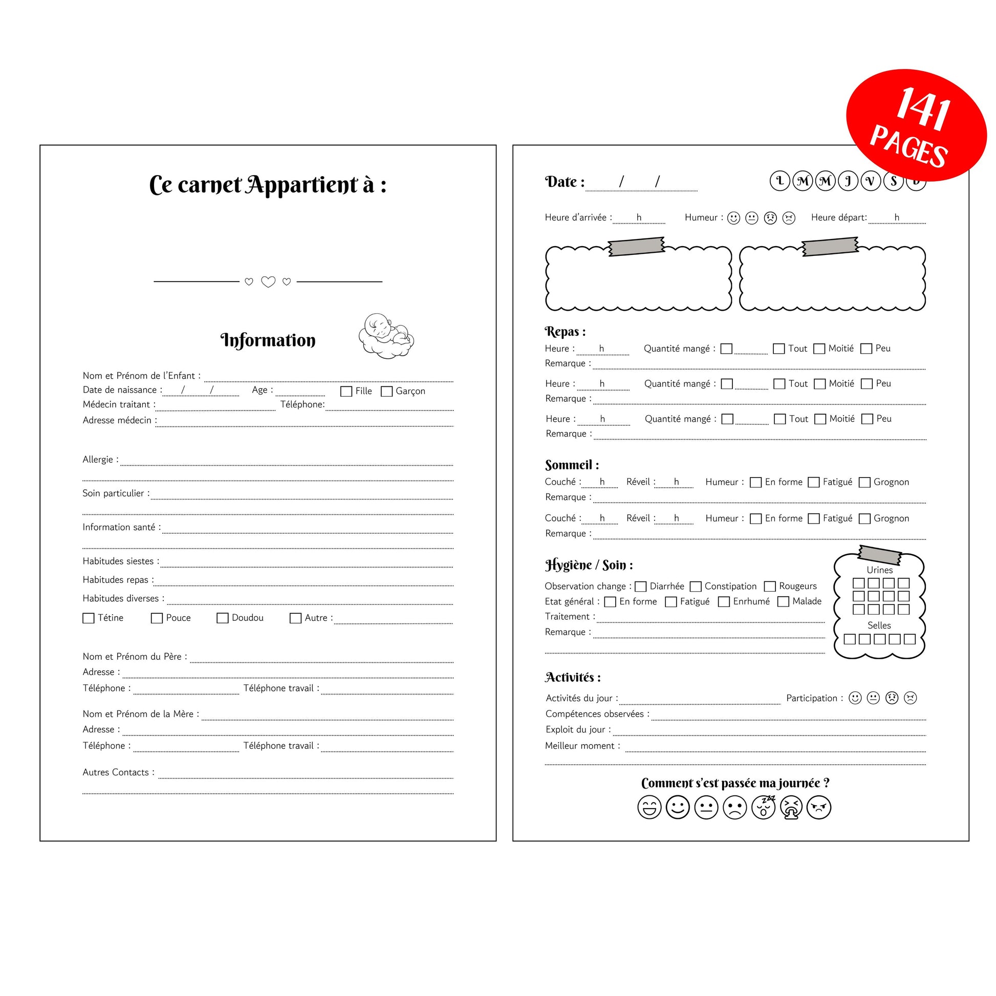👉 Conçu pour 140 jours de garde, ce carnet pratique et doux devient un véritable journal souvenir du quotidien de bébé.
